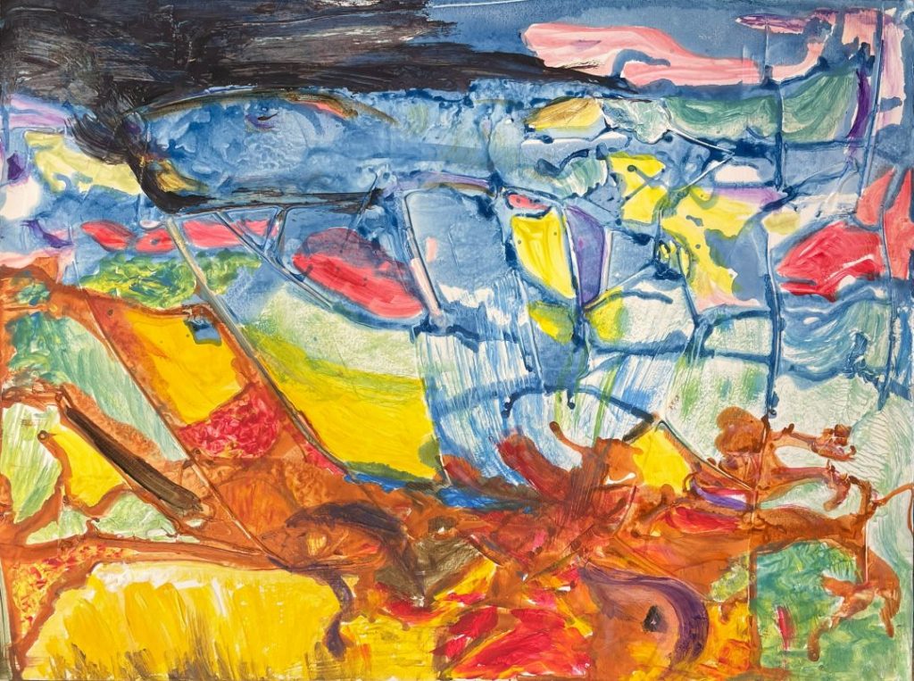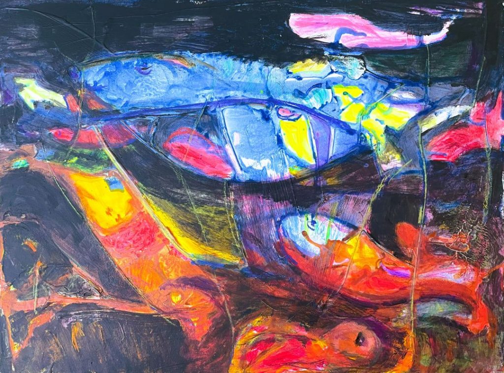 Ein gutes Beispiel sind die ersten beiden Bilder. Zunächst flossen nur Linien -per Zufall gesteuert – über die Malpappe. Im 2.Schritt habe ich die Flächen farbig gestaltet … und dann plötzlich Fische gesehen! So habe ich im 3.Schritt dann das Wasser ein bisschen beruhigt .