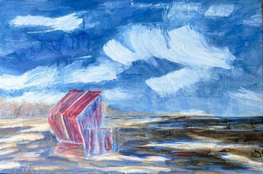 Der einsame Strandkorb am Strand hat sich schon früh ergeben. D.h. die Strandlandschaft war schnell da, der Strandkorb dann aber die gezielte Ergänzung.